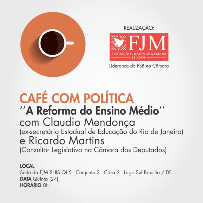 A Fundação João Mangabeira (FJM) recebe parlamentares do Partido Socialista Brasileiro (PSB) para um debate sobre a reforma do ensino médio. O evento “Café com Política” acontece nesta quinta-feira (24), na sede da instituição no Lago Sul, em Brasília. Serão discutidos os efeitos da Medida Provisória (MP) 746/2016, que pretende reestruturar o ensino médio no…