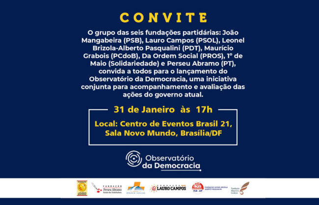 A Fundação João Mangabeira (FJM), em conjunto com cinco fundações partidárias, lançará na próxima quinta-feira, 31, o Observatório da Democracia, uma iniciativa de acompanhamento das ações do governo atual. Em defesa dos princípios básicos da democracia, entre outras conquistas sociais e econômicas, o grupo tem em comum o fato de manter posição crítica ao governo.…
