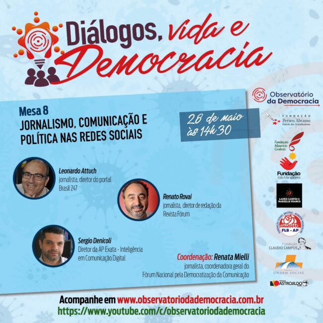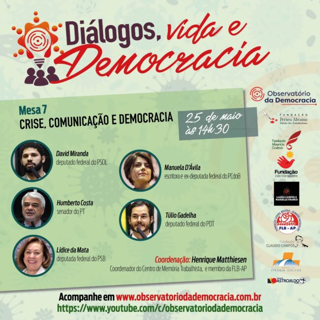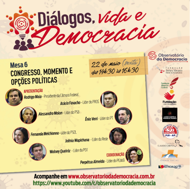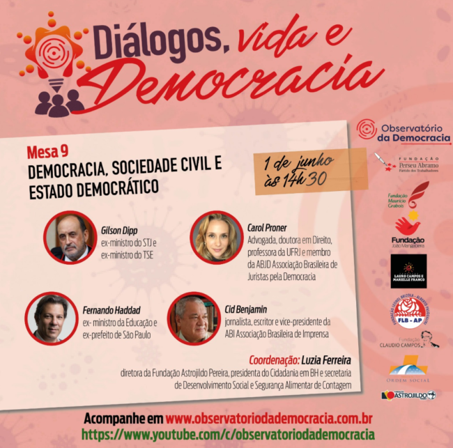 Na próxima segunda, 01/06, acontecerá a mesa Democracia, Sociedade Civil e Estado Democrático do Ciclo Diálogos, Vida e Democracia, uma série de videoconferências promovidas pelo Observatório da Democracia. A mesa será coordenada por Luzia Ferreira, que é diretora da Fundação Astrojildo Pereira, presidenta do Cidadania em BH e secretaria de Desenvolvimento Social e Segurança Alimentar…
