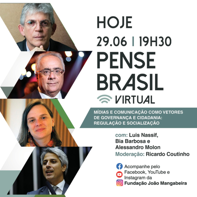 A Fundação João Mangabeira (FJM), do Partido Socialista Brasileiro (PSB), realiza o Pense Brasil Virtual: mídias e comunicação como vetores de governança e cidadania: regulação e socialização. O evento será na segunda-feira, 29 de junho, das 19h30 às 21h30. Com mediação do presidente da FJM, Ricardo Coutinho, o debate reúne o jornalista Luis Nassif, a…