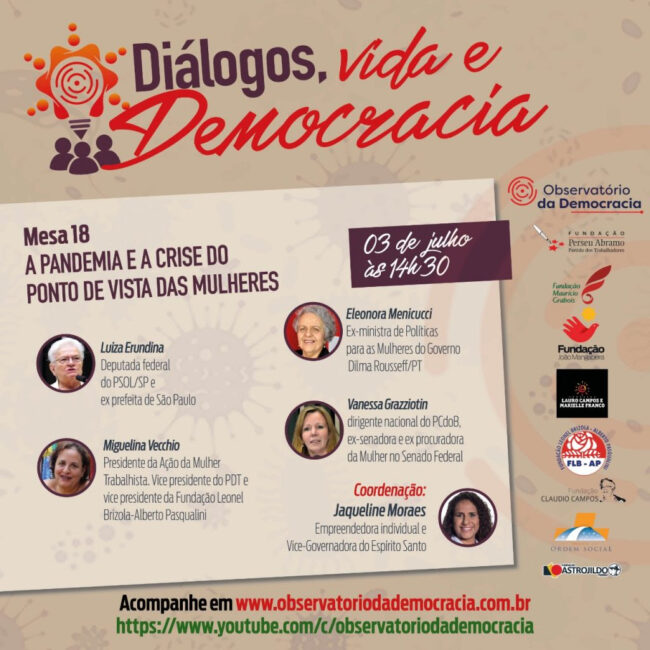 Nesta sexta-feira (03/07), às 14h30, acontecerá a mesa A Pandemia e a crise do ponto de vista das mulheres, que faz parte do Ciclo Diálogos, Vida e Democracia, uma série de videoconferências promovidas pelo Observatório da Democracia (OD), que chega a sua 18ª edição. A mesa será coordenada por Jaqueline Moraes, que é empreendedora individual e…