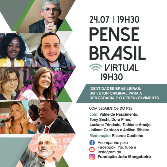 Teremos uma nova edição do Pense Brasil Virtual. O debate será mediado pelo presidente da Fundação João Mangabeira, Ricardo Coutinho, e terá como tema ‘Identidades brasileiras: um vetor original para a democracia e o desenvolvimento’. O encontro vai reunir representantes dos segmentos do PSB: Valneide Nascimento – Secretária Nacional da Negritude Socialista Brasileira Tony Sechi…