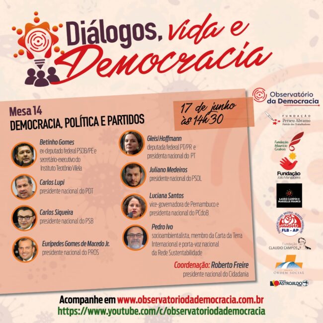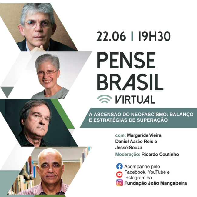 A Fundação João Mangabeira (FJM), do Partido Socialista Brasileiro (PSB), realiza o Pense Brasil Virtual: mídias e comunicação como vetores de governança e cidadania: regulação e socialização. O evento será na segunda-feira, 29 de junho, das 19h30 às 21h30. Com mediação do presidente da FJM, Ricardo Coutinho, o debate reúne o jornalista Luis Nassif, a…