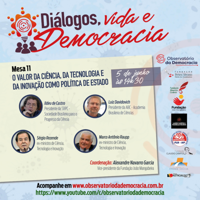 Na próxima sexta-feira (5) acontecerá a Mesa O valor da Ciência, da Tecnologia e da Inovação como política de Estado, que faz parte do Ciclo Diálogos, Vida e Democracia, uma série de videoconferências promovidas pelo Observatório da Democracia. A Mesa será coordenada por Alexandre Navarro, que é vice-presidente da Fundação João Mangabeira e membro da…