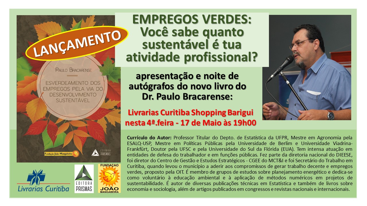 O presidente da Fundação João Mangabeira, Renato Casagrande, estará na noite desta quarta-feira, 17 de maio, na capital do Paraná, onde participará do lançamento e da noite de autógrafos do livro “Esverdeamento dos empregos pela via do desenvolvimento sustentável” nas livrarias Curitiba no Shopping Barigui. O autor Paulo Bracarense é coordenador da FJM do Paraná, professor de Estatística da UFPR, mestre em agronomia pela ESALQ-USP, Mestre em políticas públicas pela Universidade de Berlim e Universidade Viadrina-Frankfürt, doutor pela UFSC e pela Universidade do Sul da Flórida(EUA). A edição do livro recebeu financiamento da FJM e deverá integrar o acervo da Fundação.
