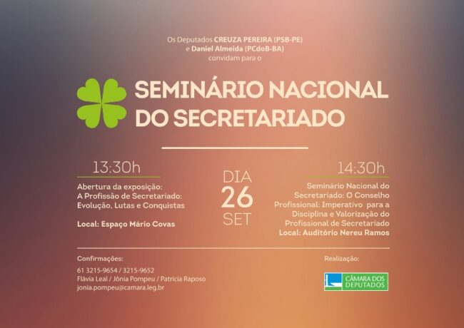 Na tarde desta terça-feira, 26, aconteceu, no Auditório Nereu Ramos, o Seminário Nacional do Secretariado. O objetivo do Seminário foi discutir a importância da criação do Conselho de Secretariado e a legalidade do exercício profissional. Antes do Seminário, tivemos a abertura da Exposição – “A profissão de Secretariado: Evolução, Lutas e Conquistas” no Espaço Mário…