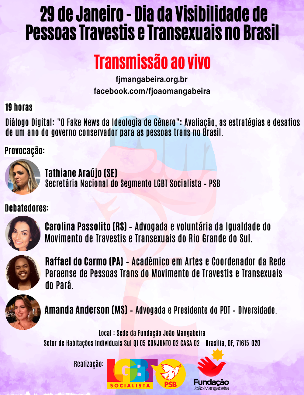 Dando seguimento ao apoio para os segmentos do Partido Socialista Brasileiro (PSB), a Fundação João Mangabeira (FJM) irá realizar, na próxima quarta-feira, 29, em parceria com a Secretaria Nacional do Segmento LGBT Socialista, um bate-papo on-line, que será transmitido ao vivo pelo Facebook e pelo portal da FJM, a partir das 19h. “A luta das pessoas Trans na sociedade tem como foco o respeito e o reconhecimento da sua Identidade de gênero que faz referência a como nós nos reconhecemos dentro dos padrões de gênero estabelecidos socialmente: masculino ou feminino”, afirma a Secretária Nacional do Segmento LGBT Socialista – PSB, Tathiane Araújo (SE).