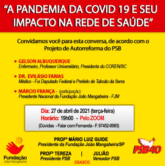 O impacto da pandemia da Covid 19 na rede de saúde será tema do próximo encontro que o PSB de São Paulo, em conjunto com a Fundação João Mangabeira (FJM/SP), estarão organizando na próxima terça-feira, 27/04, às 19h00, pela plataforma Zoom, com transmissão pelo Facebook. O evento contará com a participação de Márcio França, atual presidente nacional da Fundação João Mangabeira (FJM), presidente estadual do PSB/SP e ex-governador de São Paulo.
