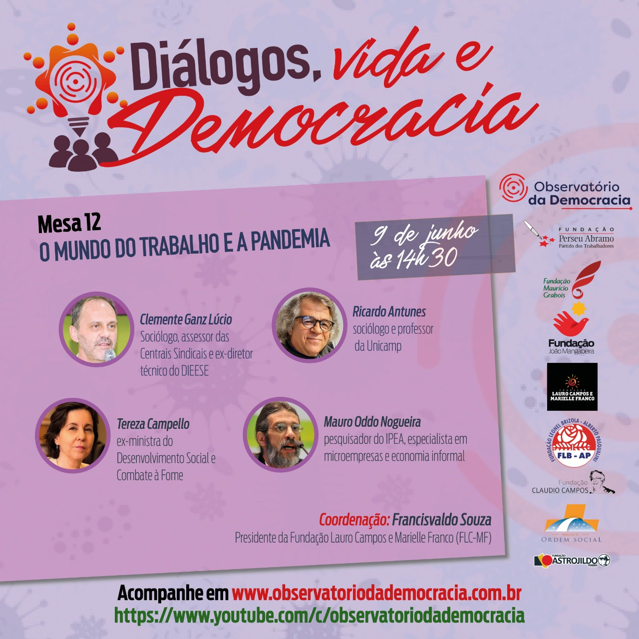 Na próxima terça, 09/06, acontecerá a mesa O Mundo do Trabalho e a Pandemia, que faz parte do Ciclo Diálogos, Vida e Democracia, uma série de videoconferências promovidas pelo Observatório da Democracia, que chega a sua 12ª edição. A mesa será coordenada por Francisvaldo Souza, que é Presidente da Fundação Lauro Campos e Marielle Franco (FLC-MF), estarão participando o ex-diretor do Dieese Clemente Ganz Lucio, a ex-ministra do Desenvolvimento Social e Combate à fome Tereza Campello, o pesquisador do IPEA, especialista em microempresas e economia informal Mauro Oddo Nogueira, o sociólogo e professor da Unicamp Ricardo Antunes e o pesquisador do IPEA especialista em economia informal.