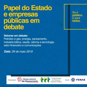 A oficina O papel do Estado e das empresas públicas será realizada no dia 29/05 em Brasília, organizada pelo Comitê Nacional em Defesa das Estatais e pelo Observatório da Democracia.Setor financeiro, petroleo e gás, saúde, ciência e tecnologia, saneamento, indústria bélica e comunicações serão os temas apresentados e debatidos por convidados das fundações e representantes sindicais e de movimentos sociais. O resultado da oficina, que está com as inscrições esgotadas, será divulgado no Observatório.