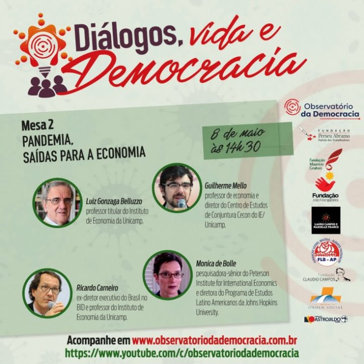 Nesta sexta-feira 08 de maio, às 14h30, o ciclo de debates Diálogos, Vida e Democracia promovidos pelo Observatório da Democracia, abordará as consequências econômicas da pandemia do Coronavírus e as saídas para a sua superação.