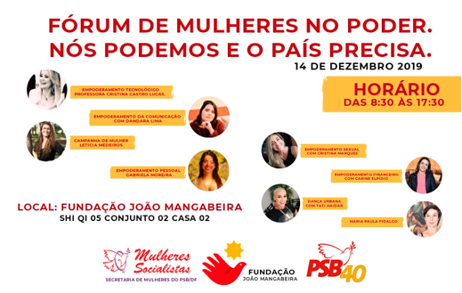 Será no dia 14 de dezembro próximo, das 8h30 às 17h30, na sede da Fundação João Mangabeira em Brasília, o Fórum Mulheres no Poder: uma iniciativa que conecta capacidades em prol da emancipação das mulheres na política e na sociedade.