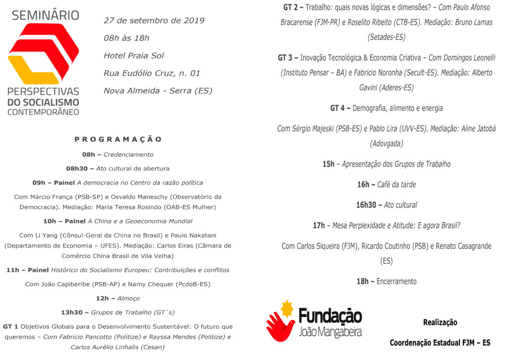 O evento trará ao estado nomes de destaque na sociologia e política brasileiras, além de especialistas em economia e inovação. A realização do seminário é da coordenação estadual da Fundação João Mangabeira (FJM), entidade sem fins lucrativos, que tem como missão a formação política e a formulação de políticas públicas socialistas. O evento contará com a realização de painéis e grupos de trabalho, que abordarão temas como a inovação tecnológica e a economia criativa; as transformações do mercado de trabalho; a China e a geoeconomia mundial; as ameaças aos direitos e liberdades individuais e o fortalecimento das instituições democráticas, entre outros.